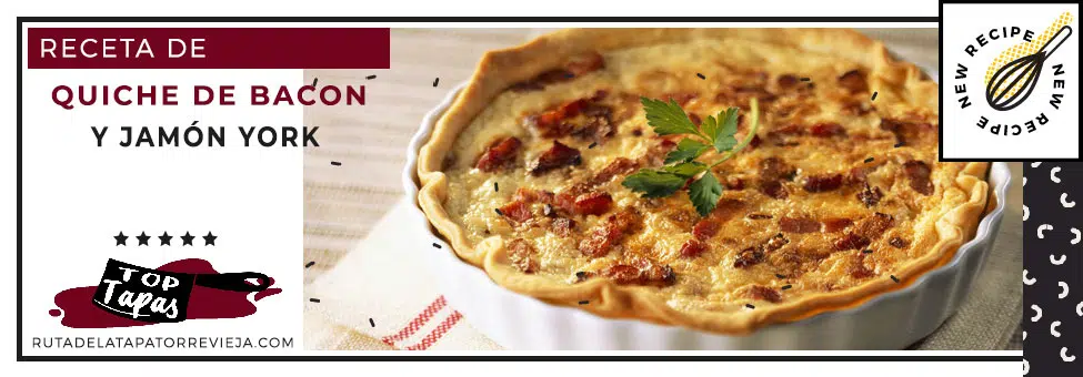 El quiche es una tarta salada clásica de la gastronomía gala, originaria de la región de Lorena, en Francia. En España suele realizarse con partes del cerdo, tal como se observa en la siguiente receta de quiche de bacon y jamón York.